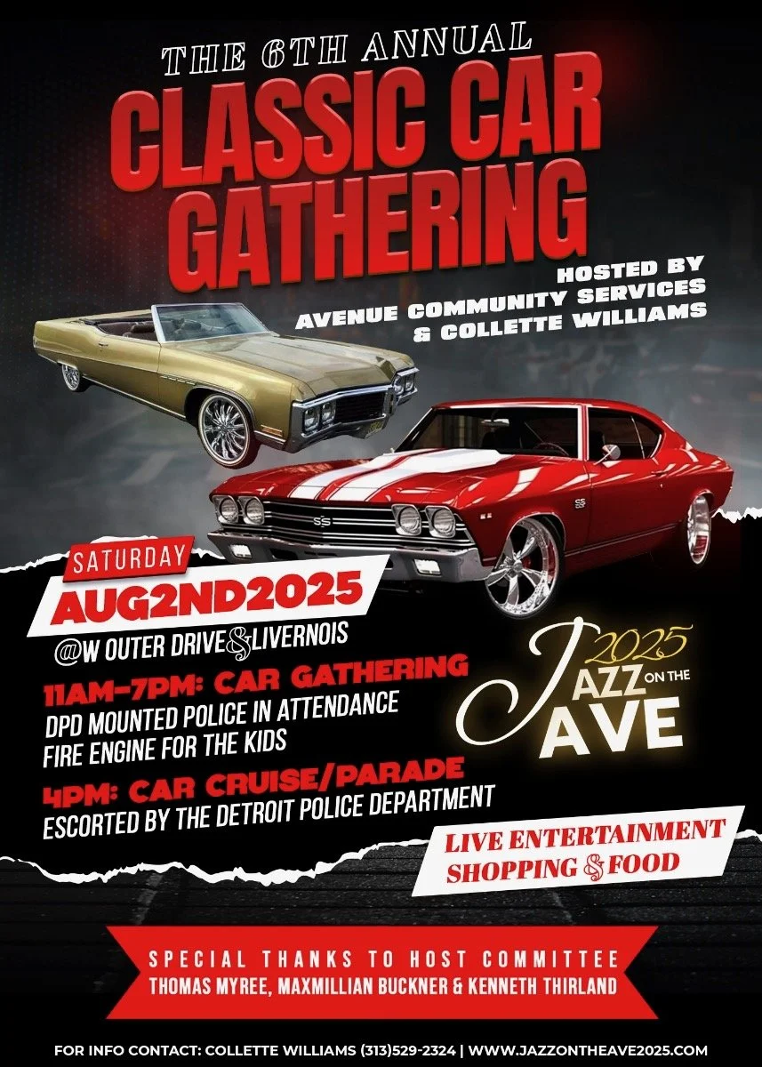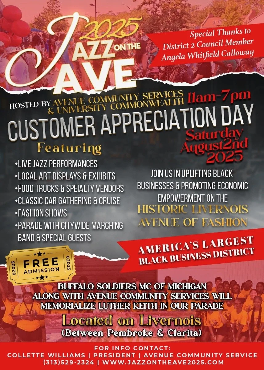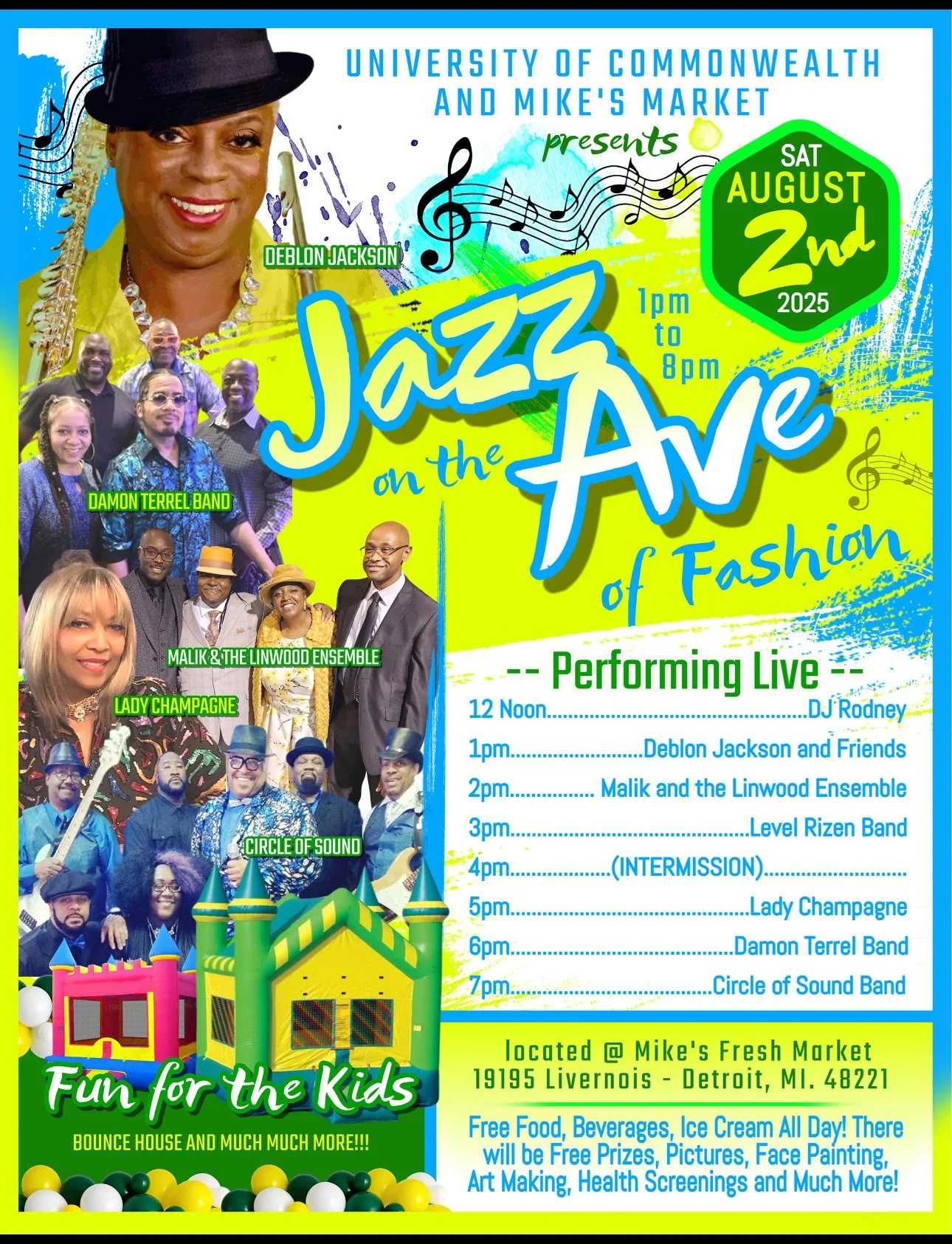 Jazz on the Ave is a celebration of Detroit's cultural legacy! Join us on the Avenue of Fashion for live music, food, vendors, classic cars, and family fun. Experience the heart of Detroit and support local businesses and artists. Don't miss the parade starting at 4PM featuring the DPD Mounted Unit, Detroit’s All-City Marching Band, Urban City Cowboy, Majik Touch Dance Company, Classic Cars, and more! See you there!